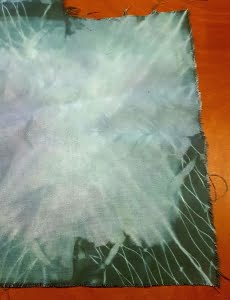 De bovenstaande lappen heb ik twee keer geverfd. Ik oefen me erin om strepen en ruitjes te maken, dus is het vouwen, met elastiekjes en keukentouw knetterhard opbinden.