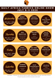 Zaterdag om 21.00 uur mag ik iets vertellen over mijn passie voor Afrikaanse stoffen. Op de poster staat 1PM – 4PM EST maar deze tijden zijn met een uur opgeschoven naar 2PM – 5PM EST. Speciaal voor dit event heb ik een video gemaakt. Hierin laat ik in een sneltreinvaart zien hoe ik een doosje maak en bekleed met een vrolijke print. Na het filmpje volgt er een gesprek met Miriam, de eigenaresse van Quilt Africa Fabric.