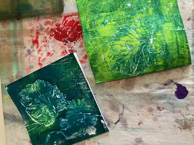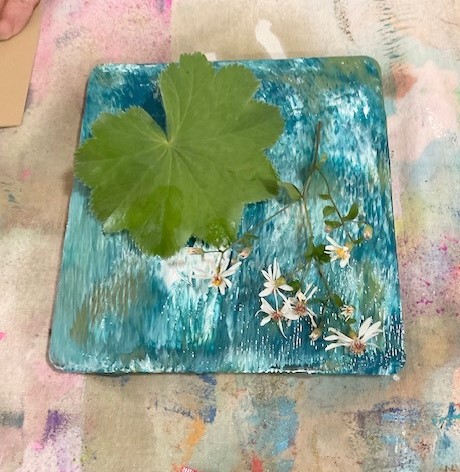 Verf op 2 verschillende gelli plates, zodat de ene kan drogen , dan kan je op de andere blijven verven. Dat heb ik ook bij Hannie gedaan. Zie onderstaande foto. Grote gelli plate is voor stof en de kleine voor verven met bladeren, zoals Hannie beschrijft