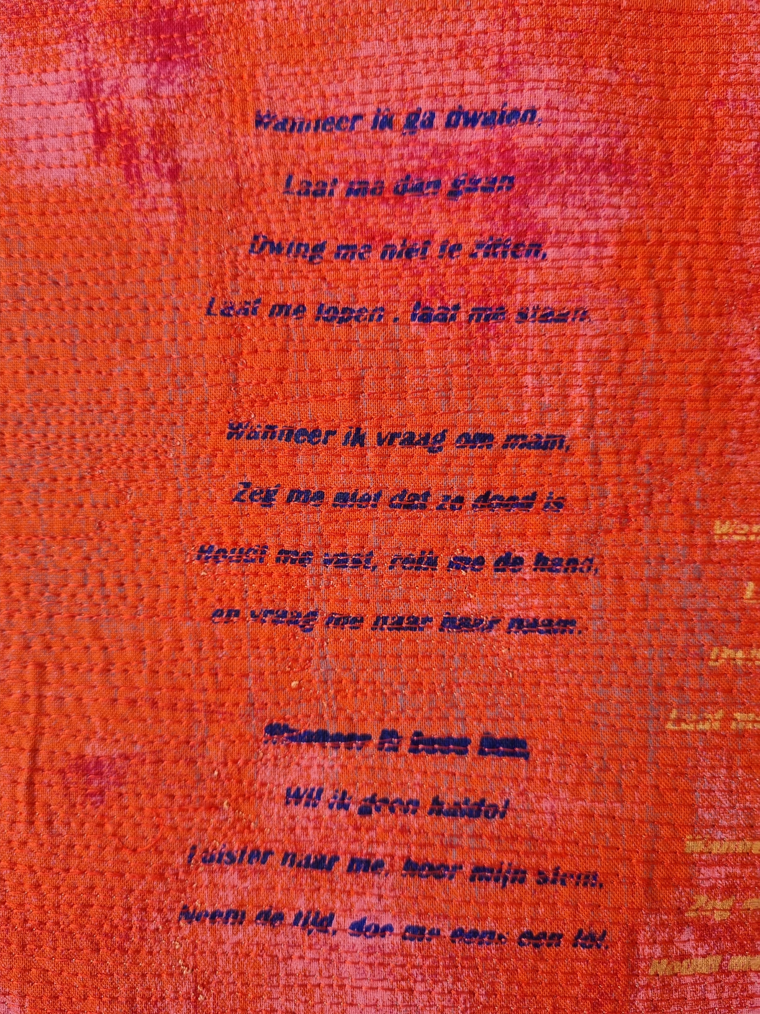 Ans Tuinman maakte onderstaand quiltje. Haar broer – Ton Tuinman – schildert en dat triggerde Ans om een glas-in-lood quiltje van één van zijn schilderijen te maken. Zij heeft dit quiltje gemaakt van grunge stofjes en het meet 40×40 cm. Wat is het geweldig als de één de ander uitdaagt om het gemaakte te vertalen in stofjes. De Glas-in-Lood techniek leent zich daar heel goed voor.