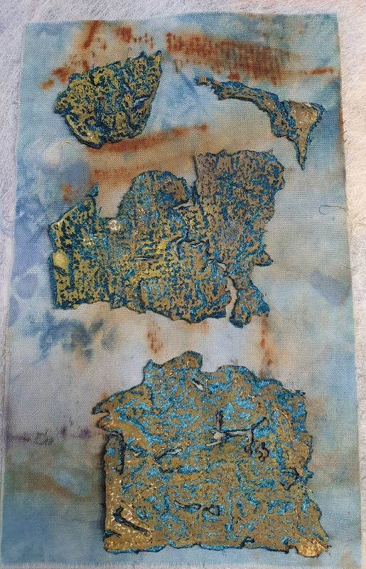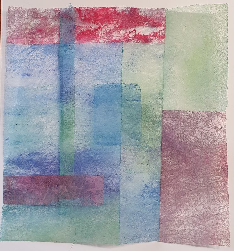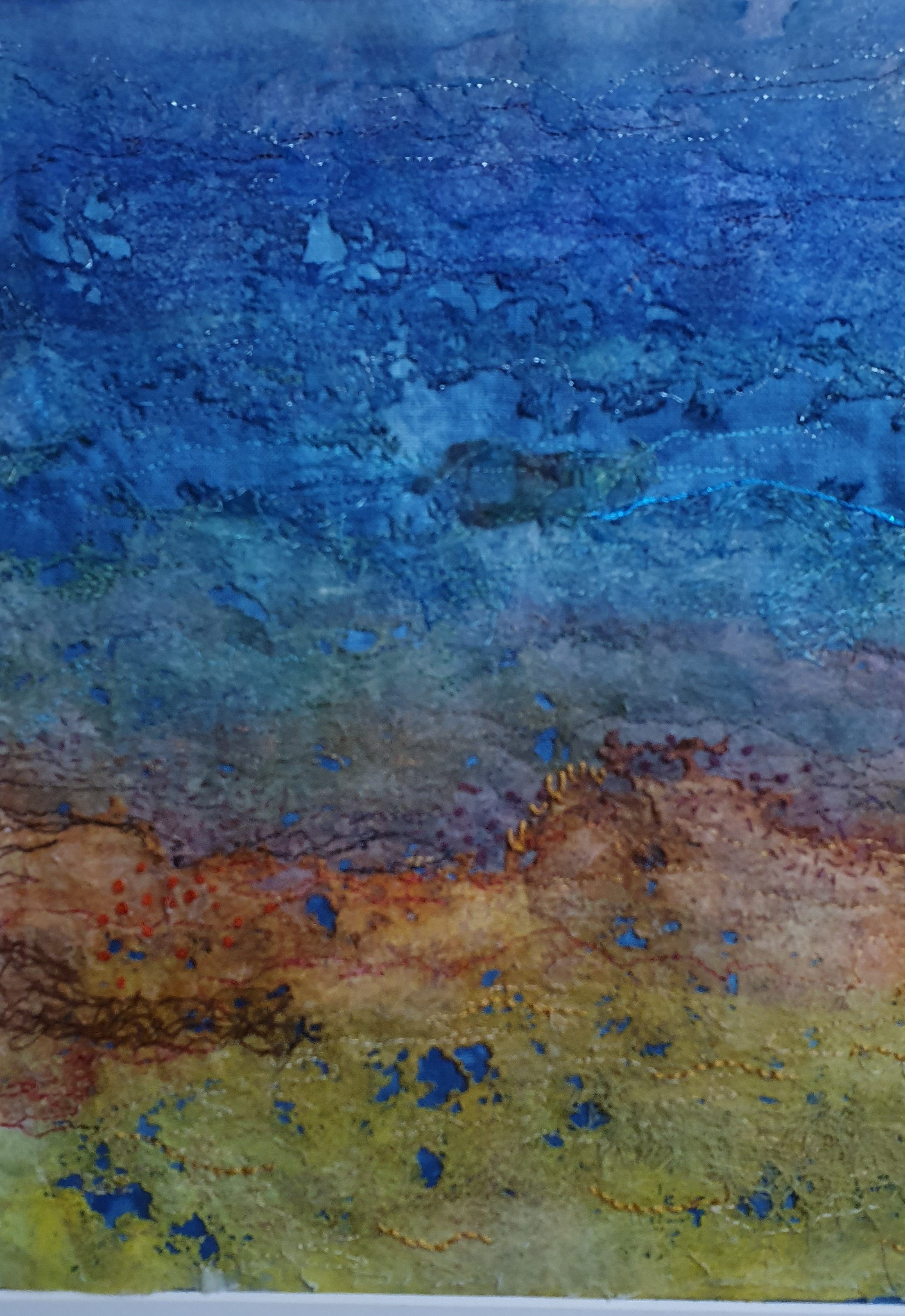 Nu zet ik de stap van woorden naar daden. Ik kies stoffen en de techniek. In zeven kleuren en de techniek, ‘Hidden Wells’, de verborgen bron, wil ik kleur, beweging en herhaling in één keer te verwerken.