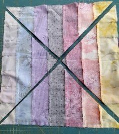 Een tweede blok, in dezelfde kleurvolgorde, draai ik een kwartslag en leg deze met de goede kant op het eerste blok. Deze twee vierkanten, op elkaar liggend, stik ik rondom dicht. Daarná snij ik het dichtgenaaide dubbele blok diagonaal, x , door. Ik vouw elk blok open en verwonder me!