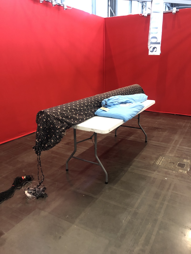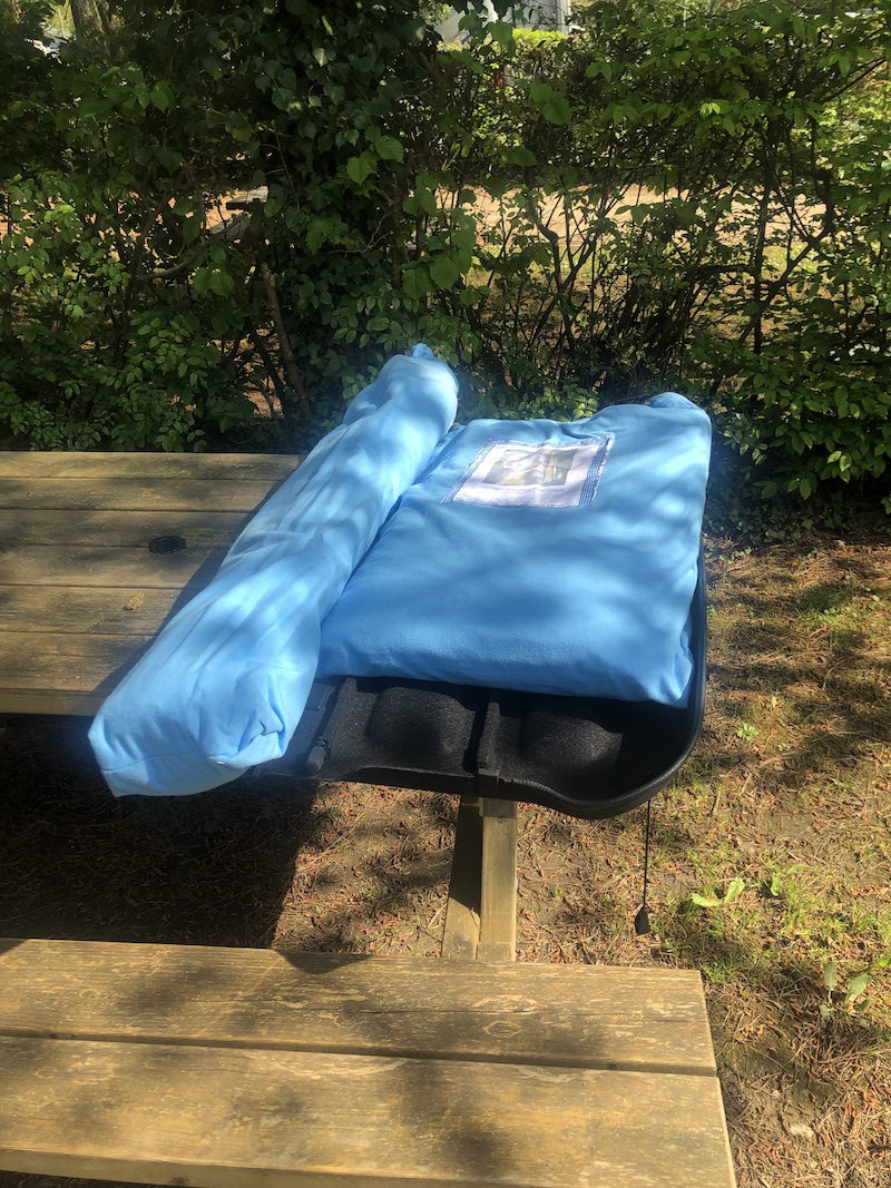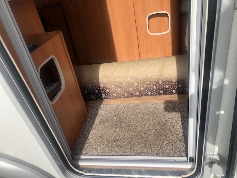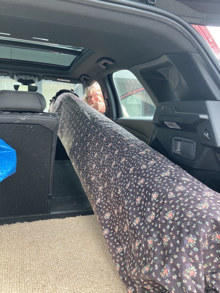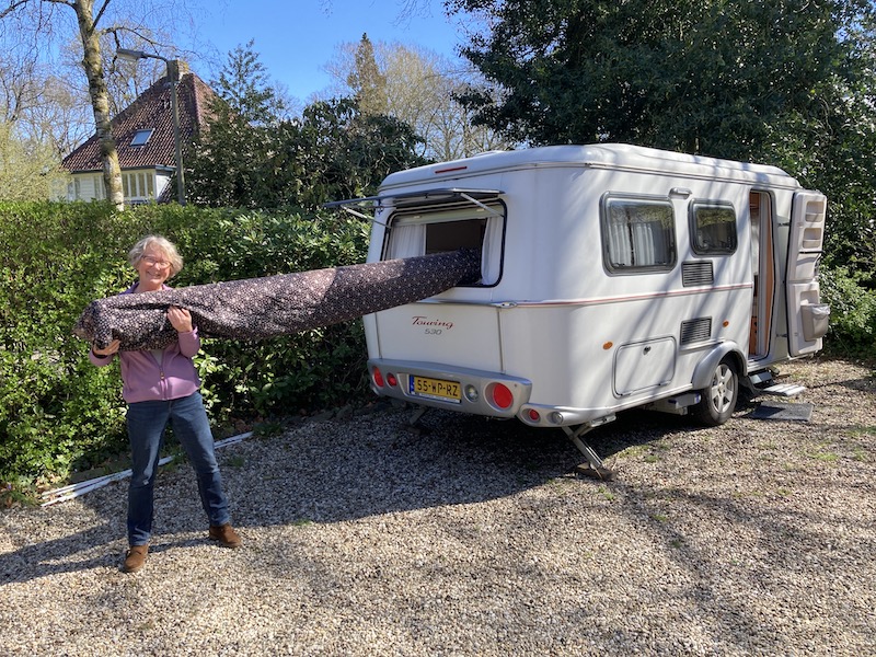 Thuisgekomen hebben we de quilt even veilig in de woonkamer gelegd. Op de dag voor vertrek hebben we de koker via het achterraam van de caravan ingeladen. Hij paste op de grond, maar daardoor hadden we zelf niet zo veel loopruimte meer.