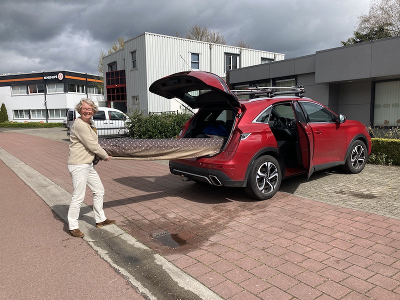 Zo’n kostbaar geval ga je niet in een doos stoppen met een postzegel erop. Dat was voor mij ondenkbaar. Dus hebben we de antieke lappendeken in de kartonnen koker opgehaald in Nijkerk en gelukkig kon hij net tussen de voorruit en de achterklep. Ik achterin achter de chauffeur weer terug naar huis.