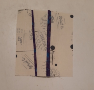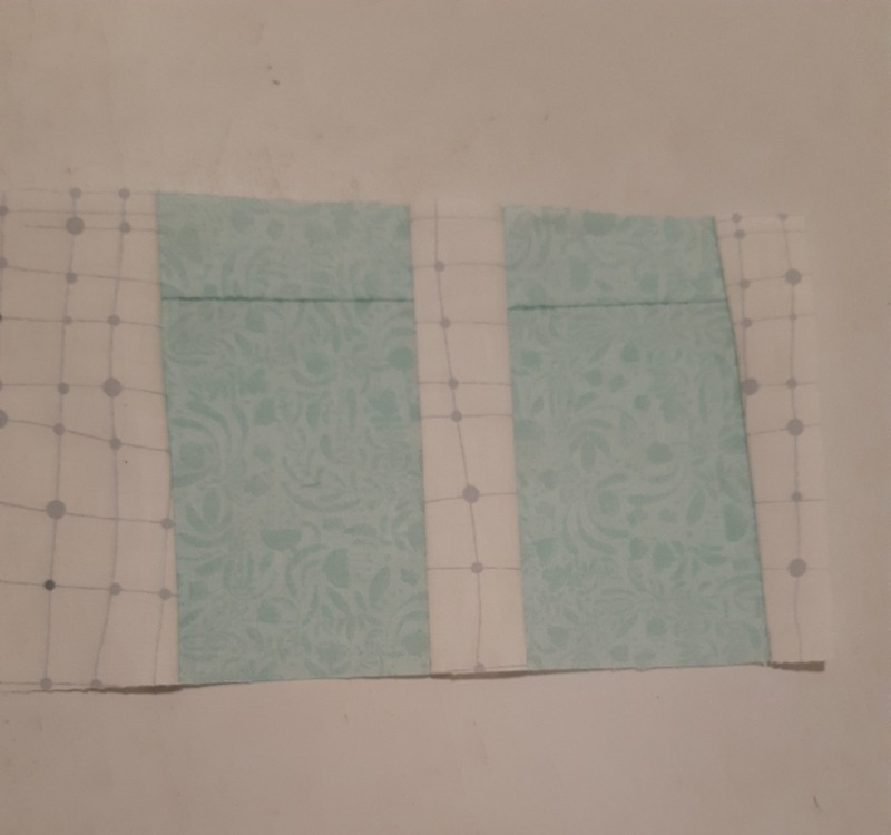Eerst een lowvolume (achtergrond) lapje pakken en 1x doorsnijden. Dat mag met een lineaal, maar dat hoeft niet. Het doorsnijden kan op de helft van je lapje, maar ook op een derde, of een vierde, net wat jij leuk vindt. Ik heb ongeveer in het midden gesneden, zo recht mogelijk. Maar je mag natuurlijk gerust schuin, of wiebelend. Net wat jij op dat moment interessant vindt. Van een gekleurd lapje snijd ik een strookje. Dat strookje naai ik tussen de beide achtergronddelen.