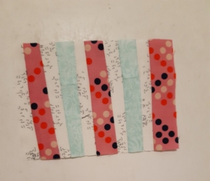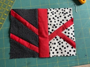 Tijdens het naaien blijven mijn blokjes niet rechthoekig, omdat ik zonder liniaal gesneden heb en niet kaarsrecht. Dat geeft niks, want ik kan de blokjes later nog rechthoekig maken. Hé, ik heb maar acht blokjes. Nou, dan start ik dus met acht. Het maakt niet uit, want het is altijd goed. Na het strijken maak ik de blokjes rechthoekig. Rechthoekige blokken is namelijk een stuk gemakkelijker wanneer ik over een tijdje, bijvoorbeeld over een maand of twee, blokjes aan elkaar ga naaien, tot een top. Nu gewoon lekker snijden en naaien. De komende tijd maak ik af en toe acht tot tien blokjes per keer met de bovengenoemde lijnvariaties. Over een maand of twee ga ik met alle blokjes die ik dan heb gemaakt, een spannende top puzzelen. Misschien komen alle blokjes in de top, misschien niet. Doe je mee?