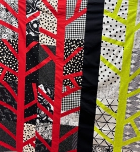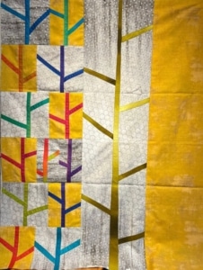 De quiltgroep MEMO in het noorden van het land komt 4x per jaar bijeen. Iedere keer kiezen we een thema en maken we een moderne quilt. Deze keer was het thema: vertakking. Hierbij denk ik meteen aan bomen en aan het Harz-gebied waar ik in september was om te wandelen. Hier zijn ongeveer 5 jaar geleden onnoemelijk veel naaldbomen bezweken door een plaag van de letterzetterkever; een heel klein kevertje dat de boom aantast. Gelukkig is het gebied inmiddels herstellende en is er nu ruimte voor nieuwe vegetatie.