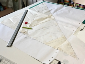 Daarna had ik niet meteen tijd om te gaan tekenen en knippen maar eindelijk kon ik ook aan de gang. Malletjes van het uitgeprinte patroon overgetrokken op de paternoplaat. Ik maak mijn paternomallen altijd zonder naadtoeslag, dan kan ik later zelf nog bepalen hoe breed ik mijn naadtoeslag wil en of de naadtoeslag in inches of centimeters gaat zijn.