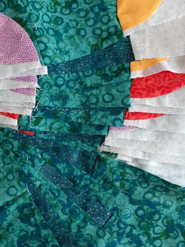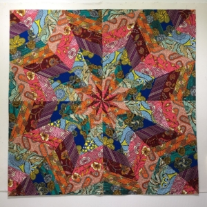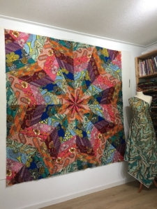 Voor deze laatste quilt was de stofkeuze best een lastige, voor de 5 hoofdkleuren wilde ik een donkere en een lichte variant met ook nog een kleurverloop. Omdat ik met nogal bonte stoffen werk, was het best zoeken naar de juiste combinatie. Terwijl ik de eerste stroken stof ging snijden was ik er nog steeds niet zeker van of dit het was waar ik naar op zoek was. Dan is het werken met een ontwerp muur (design wall) van een quilt tussenvoering tegen een hele lege muur ideaal! Eenmaal goedgekeurd zijn alle onderdelen aan elkaar genaaid. Geweldig hoe door het kleurgebruik een optisch relief effect ontstaat!