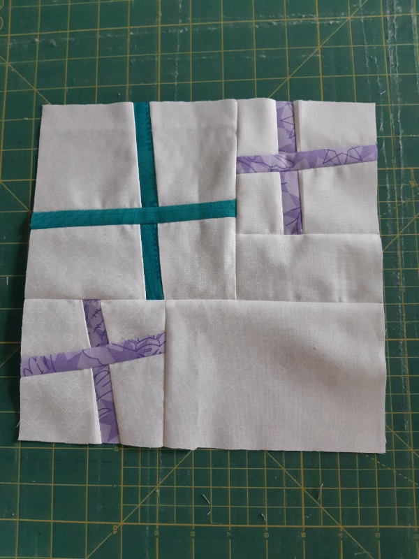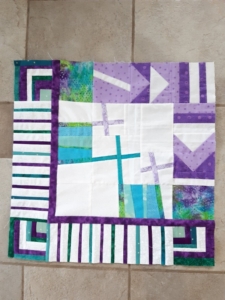 Dit is mijn beginblok. Ik ben momenteel nogal met improv (improvisatie) bezig, dus heb ik een groter en twee kleinere improvkruizen gemaakt. Improv wil onder meer zeggen dat je geen vooropgezet plan hebt, hoe je quilt eruit komt te zien. Je begint gewoon te snijden/knippen en aan elkaar te naaien. Helemaal zonder plan is ook niet nodig. Van deze techniek kun je een hele quilt maken, allemaal improvplussen, groter, dikker, kleiner, dunner, recht, scheef. Dan heb je een globaal plan van aanpak, maar geen plan voor de hele top. Toen mijn blok in elkaar zat, bedacht ik me dat het misschien leuker was geweest om 1 kleinere plus om te draaien, voor een betere verdeling over het blok. Ach ja, nieuwe ronde, nieuwe kansen. Ik vind dat veel negatieve ruimte (het wit, in dit geval) een quilt een moderne look geeft. Met mijn beginblok wilde ik meegeven: veel negatieve ruimte, improv, lijnen, kruizen, paars, wit en turquoise. Anny, die mijn blok als eerste ontving, wist niet meteen wat ze met al die negatieve ruimte moest doen.