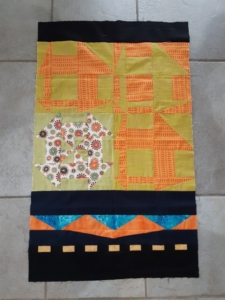 Dit is het (voorlopige) eindresultaat van de quilttop van Ans. Na mij kwam Anny weer aan de beurt, die het blokpatroon losliet en doorging met hoeken en de kleur oranje. Zij haalde blauw uit het beginblok omhoog en voegde een zwarte tussenrand toe, die een scheiding aanbracht tussen de eerste twee delen en het derde deel. Daarna kwam Ellen, die doorging met de kleuren zwart en oranje. Zij ging verder met de rechthoeken uit het beginblok en voegde een kop en een kont toe aan het geheel, door onder en boven een zwarte rand aan te brengen.