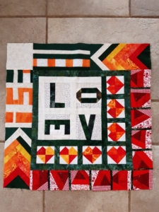 De derde ronde. De top voor Ellen. Zij was begonnen met de letters L,O,V,E in wit en groen. Ans werkte door met blokjes en gebruikte de kleur groen als verbinding tussen de blokjes. Ze voegde hartjes als symbool voor de liefde toe, alsmede de kleuren oranje en rood. Ik wilde eigenlijk geen blokjes maken, omdat dat mijns inziens niet zo modern is, maar ik vond geen mooi alternatief. Dus de blokjes ook doorgezet, met het groen als verbinding. Als nieuwe toevoeging wilde ik rozen als symbool toevoegen. Plan A was improv rozenblaadjes snijden, maar door het kleine formaat kreeg ik dit niet voor elkaar. De curves waren te groot. Dus heb ik uiteindelijk gekozen voor improv irisquilten. In dit geval een soort logcabin met een driehoekje als basis. Daarna kwam Anny weer, die koos voor alle vier eerder gebruikte kleuren, doorzetten van letters (LOVE) is…. (vind ik een hele leuke vondst), en toevoeging van lijnen en chevrons. De chevrons kun je ook zien als braids, visgraat of vlecht.
