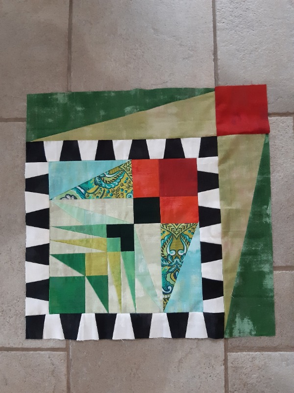 Toen kwam Ans. Zij brak met alles door er een zwartwit kader van vingerhoedjes (of tumblers) omheen te maken. Een heel mooi geheel, maar de top was eigenlijk nog niet af. Ik moest er ook nog een stuk aan toevoegen. Daar heb ik een hele tijd over nagedacht wat ik er mee moest, tot ik besloot het voorbeeld van Ellen te volgen. Ik bleef in de kleuren groen en rood, behield de vorm en werkte van licht naar donker. Vanwege de keuze voor grunchestoffen door Anny (en Ans) ging ik weer terug naar de grungestoffen.