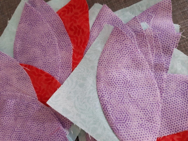 Dóór naar het maken van de blokken. Eerst alle blokken met ovalen, goed gelet op de richting en de kleurcombinaties. Dat was toch lastiger dan ik dacht. Nadat ik hier en daar toch wat stukjes weer uitgehaald had en op nieuw aan elkaar genaaid had, omdat ik het precies verkeerd om had gedaan, kwam ik erachter dat alle blokken met twee kleuren gespiegeld waren. Dus ik had die stukken niet opnieuw hoeven doen, ik deed twee blokken tegelijkertijd. Maar goed, dat zag ik dus te laat, dus maar weer gewoon hophop door. Daarna de ninepatchblokken. Eerst de donkere versie. Waarom? Geen idee, dat maakt helemaal niet uit.
