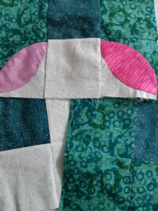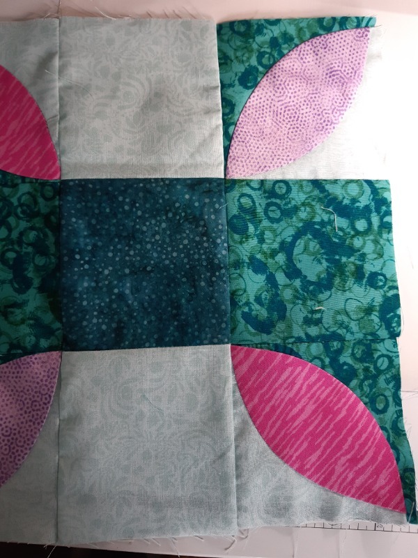 controleerde ik mijn vierkante inch. Bleek mijn printer het dus net iets kleiner uitgeprint te hebben. Op zich geen probleem, want dan zijn al mijn malletjes wat kleiner, en dan past het nog steeds. Maar niet met de vierkanten die je zonder malletjes knipt. Dus moest ik uitrekenen wat mijn printafwijking was. Dat kon ik dan weer controleren aan de hand van het eerste blokje dat ik zou maken. Dus ik gauw aan de slag, haast haast. Één hol hoekje aan een ovaal genaaid.