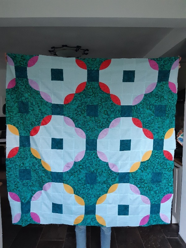 Als ik naar het ontwerp van deze quilt kijk, zeg ik deze valt onder modern. De felle kleuren die zijn gebruikt.