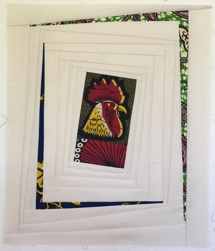 Traditioneel is het middelste vierkantje, het vuur, rood van kleur. Dus neem ik het hoofd van de haan met de rode kam. Daaromheen naai ik stroken met verschillende breedtes vast. Bij elke nieuwe strook selecteer ik een nieuwe kleur die goed ‘aanvoelt’, ik heb dus geen vooropgesteld plan.