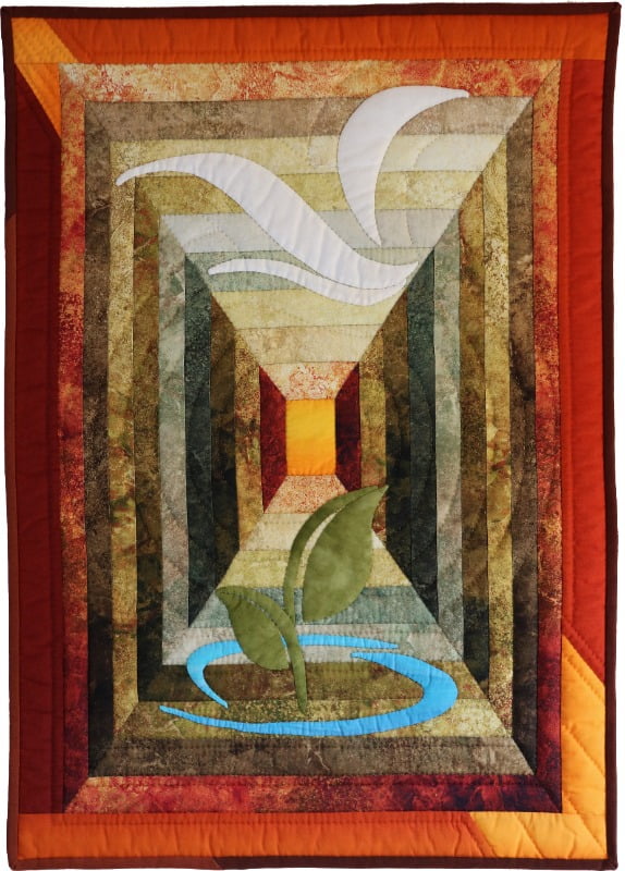 Riek Kroeze-Willemse haar mooiste plekje in Twente is de Kroezeboom op de Fleringer Es. Het is een zomereik en naar alle waarschijnlijkheid één van de oudste bomen van ons land. Kroezeboom betekent kruisboom: een boom die een grens of een kruispunt aangeeft. Riek heeft de Kroezeboom gemaakt in de Kimekomi patchwork techniek. Het is een techniek uit Japan. Er wordt een patroon getekend op foamboard en vervolgens met een mesje gesneden. De stof wordt over het patroon geplaatst en in de sneden gestopt vertelt Riek. Kimekomi betekent letterlijk “in een groef stoppen”.