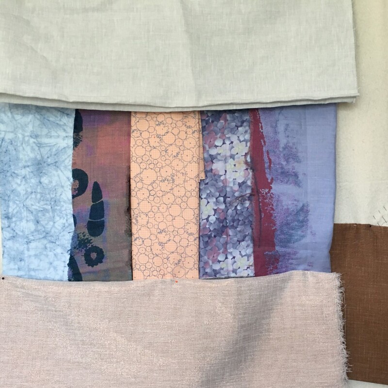 Kleur: wat betekent dat eigenlijk voor me? Hierbij kwam ik uit op : afspiegeling van een stemming, een beeld in mijn hoofd. Ik vond het zelf heel bijzonder om na te denken over welke kleur gevoelsmatig past bij de tekst. Natuurlijk neem je jezelf mee en dat betekent kleur- en tintvoorkeuren. Dan moet je kritisch worden naar jezelf en écht nadenken wat past bij deze tekst. Wat betreft sfeer kwam ik uit op: ‘ochtendmist en opgaande zon’ in waterige aquareltinten. Dat brengt voor mij, bij mijn tekst: sfeer, symboliek en zachtheid. En laat ik nou in mijn voorraad stofjes een perfecte vertaling vinden van die sfeer. Ik werd er helemaal blij van. Niet veel later kwam er ook nog een aquarelwerk van @felicity.keefe langs, die ik op Instagram volg. Zelfde sfeer, kleuren en symboliek. En toen wist ik het zeker. Deze kleuren gaan het worden.