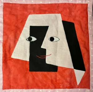 Zie je alle leuke details op de randen van de blokken? Dat zijn Sue, haar vriendjes en haar dieren. Alles is gemaakt van Japanse geweven stoffen, of een kleine stukjes voor de kleding na……