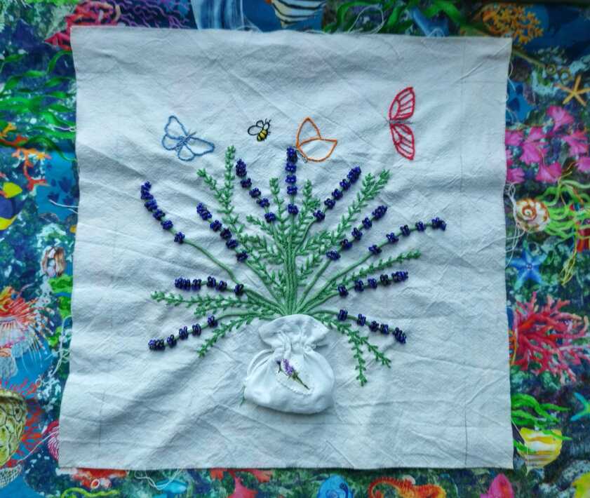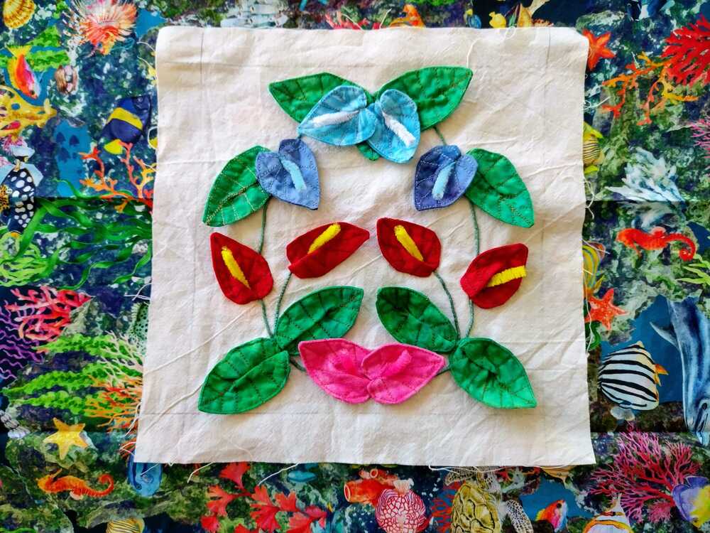 Dit is een andere manier om een patroon op stof over te brengen. Hier kun je voor een soortgelijk resultaat ook een stempel onder de stof leggen of iets anders met reliëf.