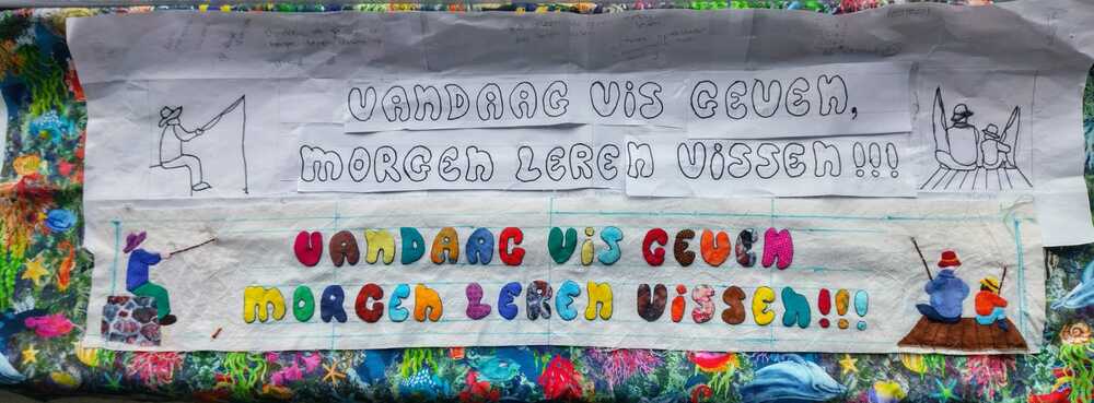 Met dit in gedachten heb ik de onderste tekst gemaakt: ‘vandaag vis geven, morgen leren vissen’.