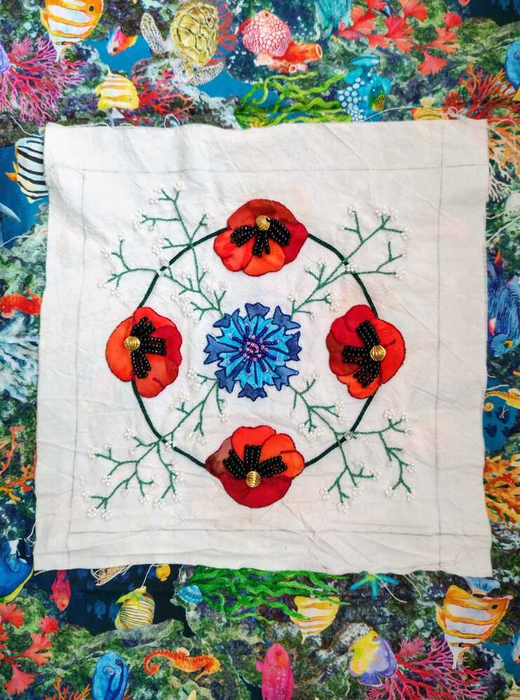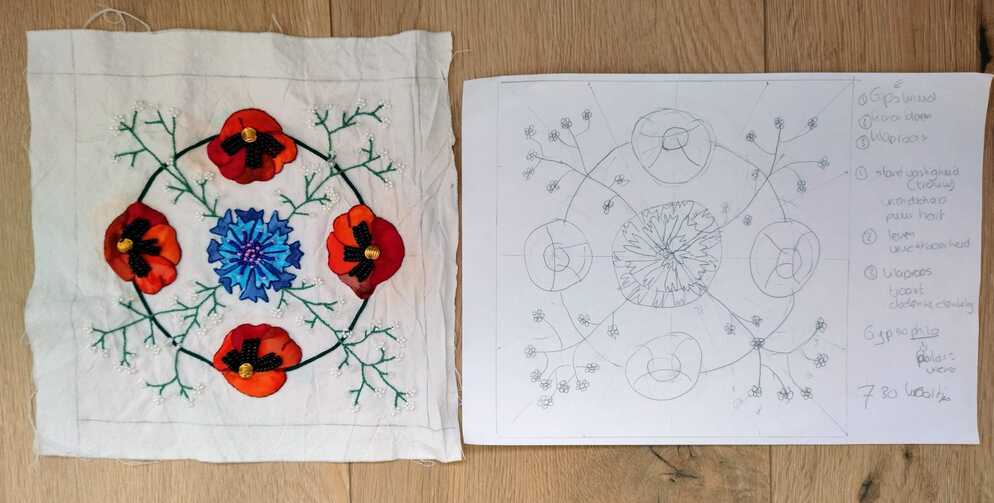 Ik ging zelf het proces door, koos een gedicht (Zoek niet te ver van Hans Bouma) en bedacht daarbij een quiltontwerp. Leuk om te doen. Een weg waarin je beslissingen neemt. Beslissingen waardoor je in het maakproces sneller werkt.