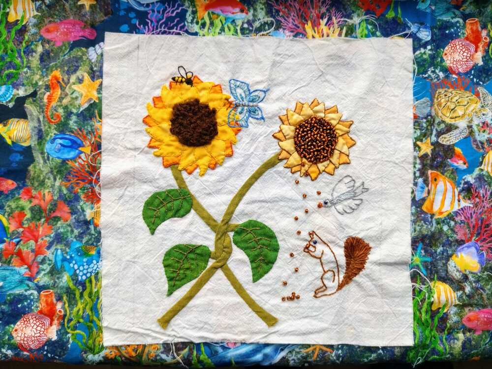 Achtergrondstof past goed bij de grote, net zoals de rimpeling door het handquilten in de sashing. (stroken).