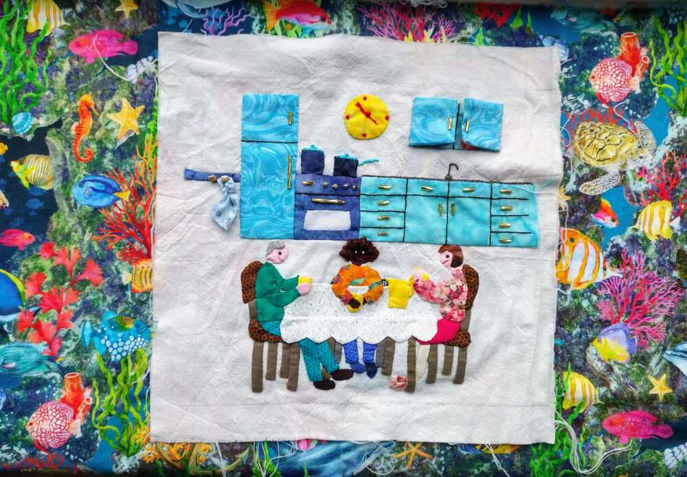 Het quilten heb ik met de hand gedaan. Bij iedere blok of sashing bedacht ik ‘wat past bij dit blok’. Zo heb ik in de keuken en badkamer een verschil tussen vloer en muur willen creëren.
