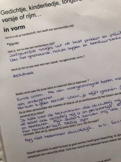 Vanuit Joke/Liesbeth kregen we elke week een mail met daarin achtergrondinformatie en vragen. De informatie en vragen die bijv. bij stap 1. hoorden gingen met name over hoe kom je tot de keuze van welke tekst je gaat gebruiken voor jouw project. De vragen zetten je aan om dieper na te denken over het “waarom” van jouw keuze. De antwoorden op de vragen zette je op papier en stuurde je naar je quiltmaatje. Zij las de antwoorden en gaf feedback en stuurde die terug. Door zo met elkaar te communiceren kon je een weloverwogen keuze maken en kreeg je steeds meer feeling met jouw gekozen tekst.