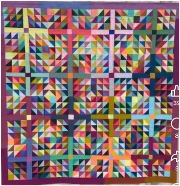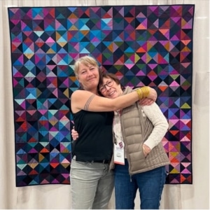Dit jaar was zij de hoofdgast tijdens Quiltcon met een eigen tentoonstelling. Dit is zij op de laatste dag van de tentoonstelling met haar moeder, die uit Californie was meegekomen. Ik kon daar jammer genoeg niet naar toe, maar ik heb via het MQG haar lezing alsnog kunnen zien en horen. Ze vertelde daarin over haar ontwikkeling van traditionele quilter naar moderne quilter, zonder dat ze deze termen toen kende. Dat begon in 2001 met een patronen boek uit 1931 (!). Ze vertelde ook van de quilt van een onbekende Afrikaans-Amerikaanse quiltster, gemaakt in effen stoffen, die haar zo raakte en de inspiratie vormde voor haar verdere ontwikkeling.