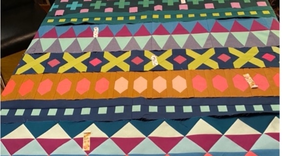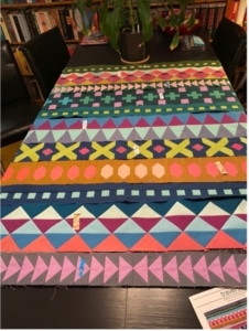 Ik heb ontzettend veel geluk gehad, dat ik een winkel in de VS heb kunnen vinden, die bereid was mij het patroon en de stoffen te sturen. Het is een leuke quilt om aan te werken met veel verschillende technieken. De grootste uitdaging is om heel precies te werken, want alle randen moeten exact even lang worden. Aan het eind van een rand een stuk er aan zetten of een stuk af snijden is niet altijd een optie, omdat de blokken vaak helemaal tot het eind doorlopen. De quilt is nog niet af, want er kwam een ander project tussen door, dat een deadline had ivm een huwelijks jubileum. Dat kun je zomaar hebben, niet waar.