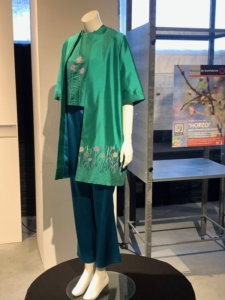 Het eerste werk wat we zagen was een fraai kostuum in groen en blauw van Yvonne Scheele-Kerkhof. Er stond iemand foto’s van te maken, zij bleek de maakster te zijn. Dus ruimte om vragen te stellen, hoe heb je het gemaakt? Fraai kantwerk vormden die randen met bloemetjes. Dit werd aangevuld met borduurwerk waarbij draden uit een onder liggende stof laag omhoog werden gehaald. Ook was een andere vorm van kant als versiering van de rug naad gebruikt. We werden met meer details vergast en het feit dat het totale werk 4 jaar aan regelmatig werken kostte.