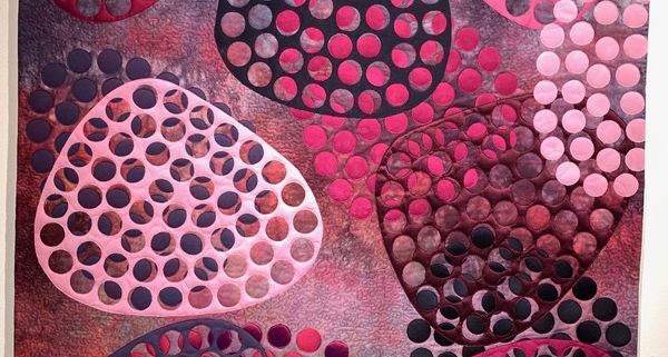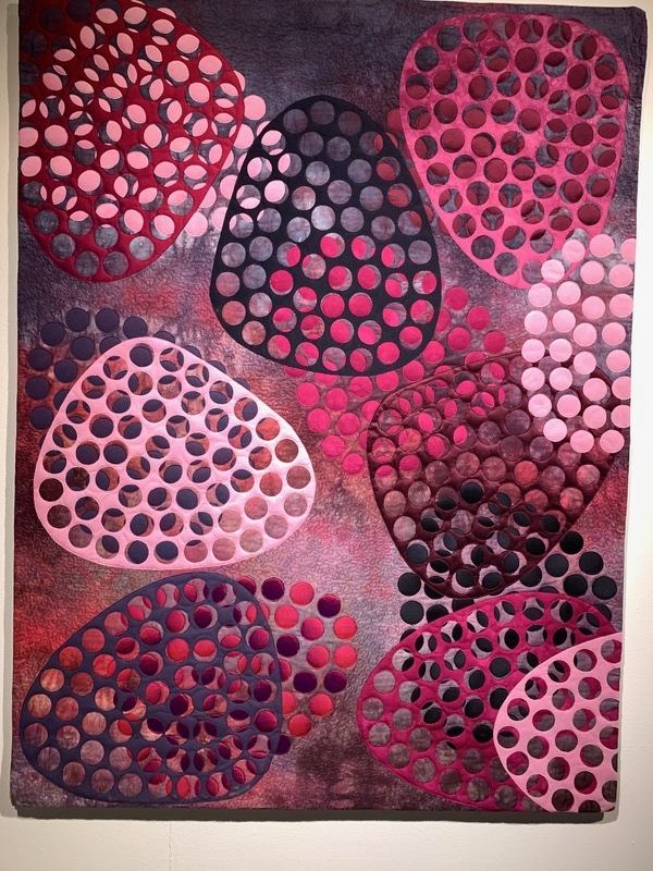 Het was een keur aan technieken, naast kant, vilt, weefwerk, ook enkele quilts, o.a. deze van Rita Dijkstra gemaakt op een fraaie ondergrond met een laag kleine cirkels en daar weer een toplaag met de open ruimten overheen.