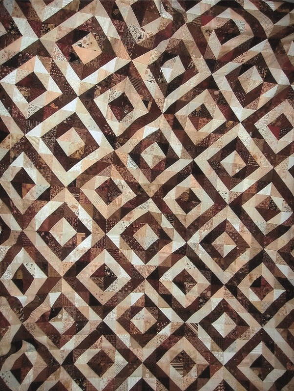 Door te spelen met de kleuren kan je verschillende patronen maken. En met een andere maat wordt de quilt groter of kleiner. De antieke quilt is gemaakt van lapjes in veel verschillende kleuren, het meeste donkerbruin maar ook groenig, blauw, roest en oker zijn erin verwerkt. Maar blauw-wit, rood-wit of juist heel scrappy leveren ook verrassende resultaten op. Zie onderstaande foto’s voor een ‘moderne look’.