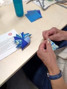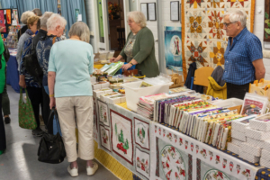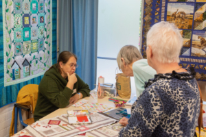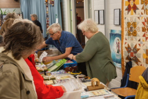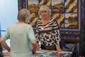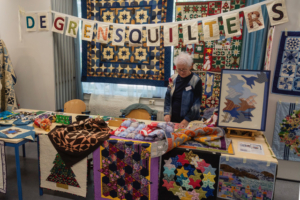 Naast de quiltjes van de Tentoonstelling van Miniatuurquilts waren er in De Pracht in Waalre maar liefst vier quiltbee’s uit de omgeving aanwezig. De muren hingen vol met hun quilts en op de tafels lagen nog meer prachtexemplaren om te bewonderen. De Stiching Verdanda was op beide dagen aanwezig en kreeg veel belangstelling. Ook de winkel de Quilt Puzzel uit Eindhoven had het lekker druk. Er zijn weer heel veel molentjes en naaldenmapjes gemaakt aan de make&take tafel. Jong en oud namen plaats, soms waren er stoelen te kort!
