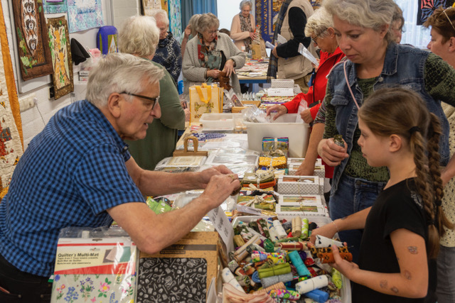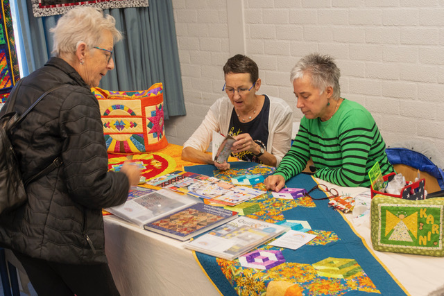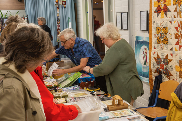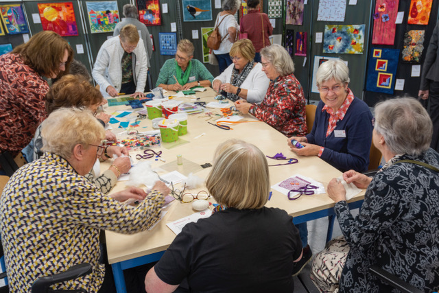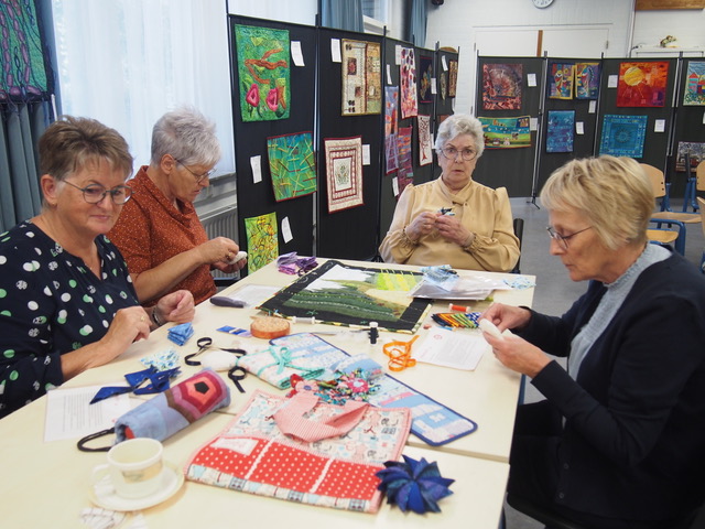 Naast de quiltjes van de Tentoonstelling van Miniatuurquilts waren er in De Pracht in Waalre maar liefst vier quiltbee’s uit de omgeving aanwezig. De muren hingen vol met hun quilts en op de tafels lagen nog meer prachtexemplaren om te bewonderen. De Stiching Verdanda was op beide dagen aanwezig en kreeg veel belangstelling. Ook de winkel de Quilt Puzzel uit Eindhoven had het lekker druk. Er zijn weer heel veel molentjes en naaldenmapjes gemaakt aan de make&take tafel. Jong en oud namen plaats, soms waren er stoelen te kort!