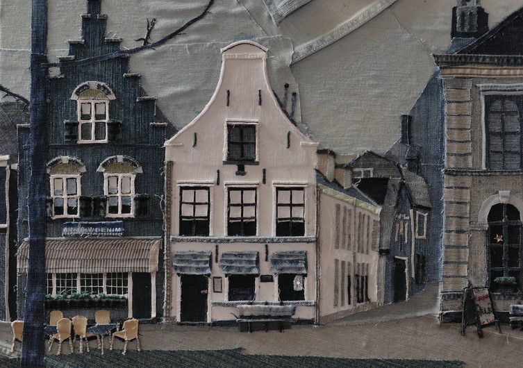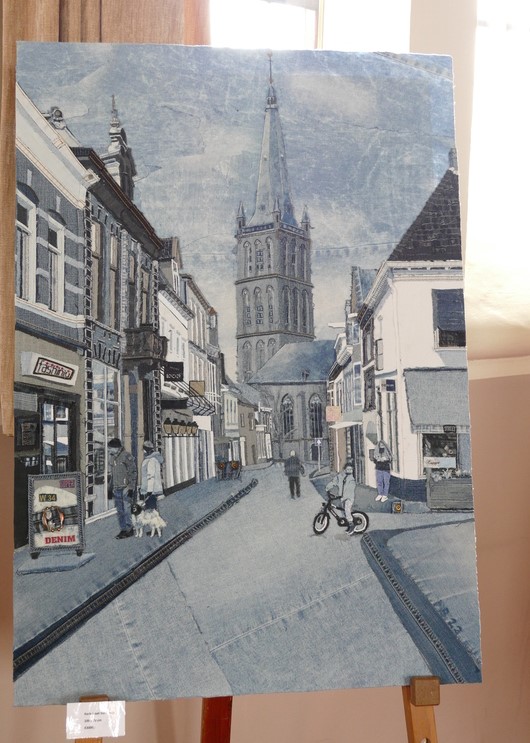 Marrie Bel met haar denim schilderijen: