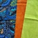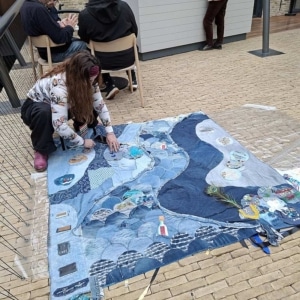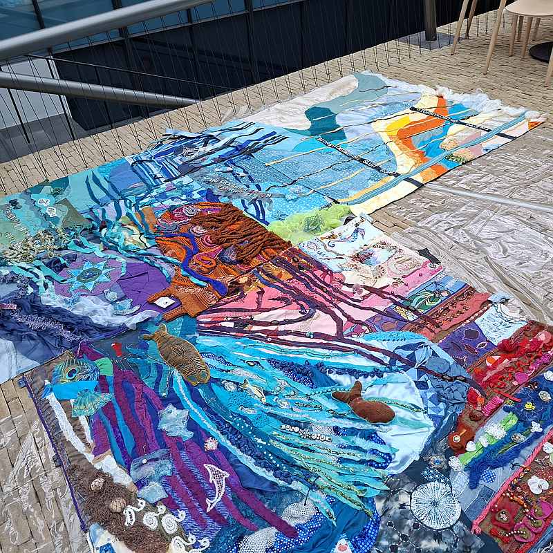 Aan een lange tafel waren ook meegekomen jongeren bezig met het versieren van rondjes spijkerstof. Dat worden golfjes en daarmee wordt de achterkant van de banners samengesteld. Als je niet kan komen, kan je ook op die manier bijdragen: maak een cirkel van spijkerstof en bewerk alleen de bovenkant. Lees daarover ook meer op de website van het festival. Die worden als golfjes op elkaar gelegd als een clamshell. Hier zie je een achterkant. De ontwerpster zelf, Anna, zit ernaast, zij was erbij deze dagen.