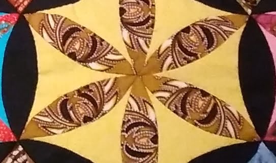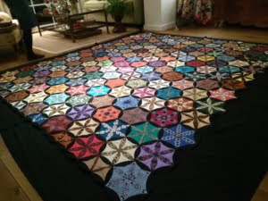 In de dagen daarna besloot ik het wagenwielen patroon door te laten lopen in de rand. En dan alle stukjes in zwart te maken. Dat betekende dus honderden stukjes extra op stof tekenen, uitknippen en naaien. De top is nu bijna af en dan kan er gesandwicht en uiteindelijk gequilt worden. Het duurt dan nog wel een poosje voor de quilt echt af is.