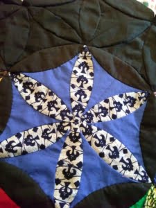 Dat alles gecombineerd, begon ik in juni wagenwielen van batik stof te maken. Gecombineerd met effen stoffen en afgebiesd met zwart. Er was zoveel stof dat mijn voornemen om nooit meer een grote quilt te maken al heel snel in het water viel. Voor onze echtelijke sponde van 2.00 x 2.20 meter had ik bedacht dat 13 x 13 blokken wel aardig zou zijn. Allemaal ronde vormen, een hele klus en alles met de hand. In december zaten ze in elkaar, 2.90 x 2.60 meter en het zag er naar uit dat ik met kerstmis kon gaan quilten… Niet dus.