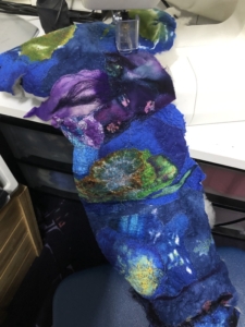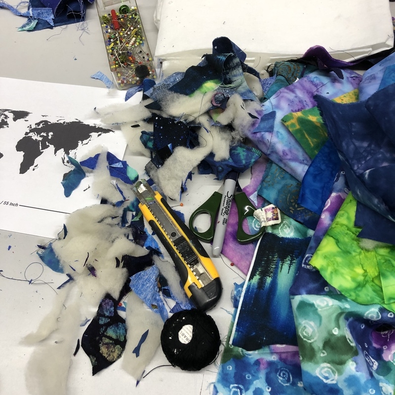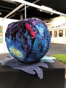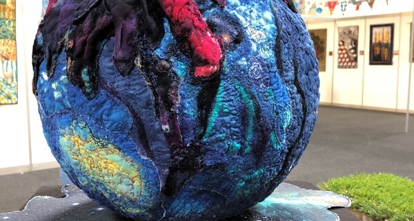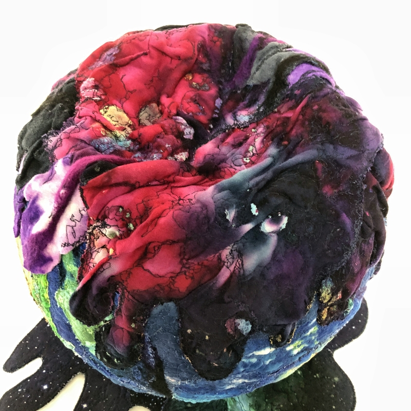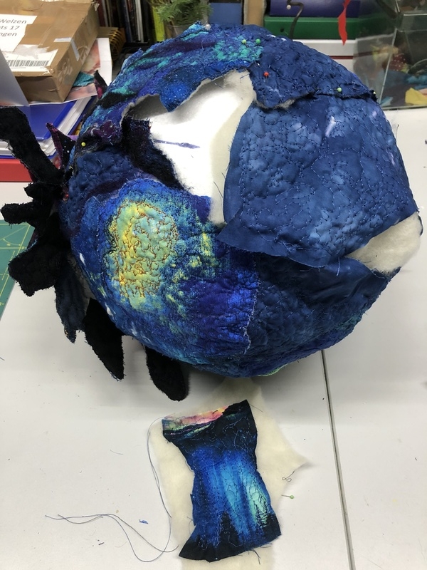 De top van de bol is driedimensionaler geworden met veel geplooide stukjes stof en opvulsels. Bij het werken aan de bol spookten er allerlei rampenfilms door mijn hoofd van overstromingen, smeltend ijs, branden, aardbevingen en vulkaanuitbarstingen.