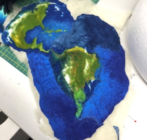 Het moest wel op een wereldbol lijken, dus de werelddelen moesten er wel bij! Met een uitgeprint plaatje van de wereld wist ik waar ongeveer de werelddelen moesten komen en , niet onbelangrijk, de vorm bij benadering.