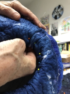 Iedere keer terug naar de bol, vastgespeld en dan het volgende stukje, steeds gepast en aan het vorige verbonden. Een vrij lange verticale naad bleef open, zodat het geheel precies om de bol paste.