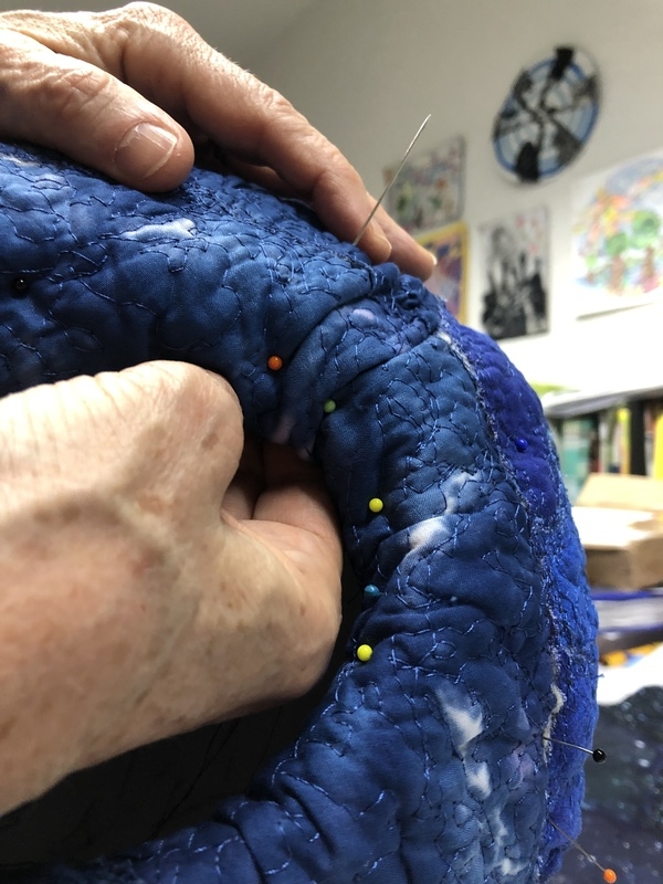 Toen het “jasje” klaar was heb ik het geheel op de bol gespeld en met de hand aan elkaar gezet En met de hand gequilt, 1 hand in de bol met een lange naald heen en weer gestoken.