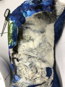 Vroeger heb ik moulage geleerd en dat kwam nu goed van pas. Iedere keer een stukje van de wereld gemaakt met een laag tussenvulling: gestikt, geplooid, bewerkt met de punchmachine en vrij machinaal borduren.