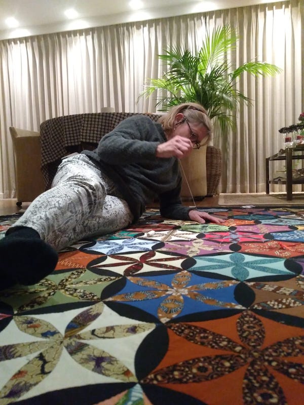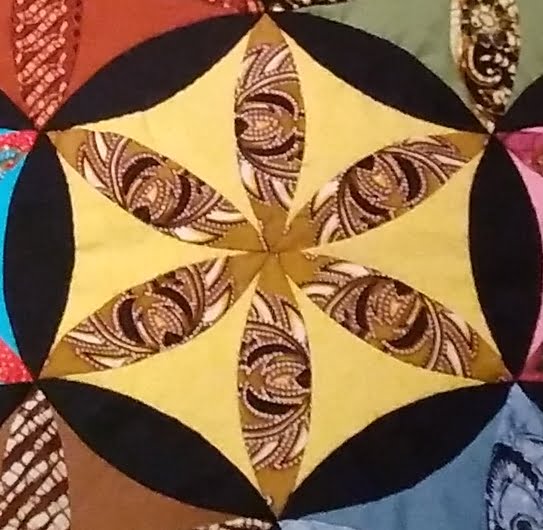 Dat alles gecombineerd, begon ik in juni wagenwielen van batik stof te maken. Gecombineerd met effen stoffen en afgebiesd met zwart. Er was zoveel stof dat mijn voornemen om nooit meer een grote quilt te maken al heel snel in het water viel. Voor onze echtelijke sponde van 2.00 x 2.20 meter had ik bedacht dat 13 x 13 blokken wel aardig zou zijn. Allemaal ronde vormen, een hele klus en alles met de hand. In december zaten ze in elkaar, 2.90 x 2.60 meter en het zag er naar uit dat ik met kerstmis kon gaan quilten… Niet dus.