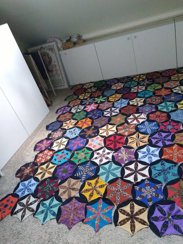 In de dagen daarna besloot ik het wagenwielen patroon door te laten lopen in de rand. En dan alle stukjes in zwart te maken. Dat betekende dus honderden stukjes extra op stof tekenen, uitknippen en naaien. De top is nu bijna af en dan kan er gesandwicht en uiteindelijk gequilt worden. Het duurt dan nog wel een poosje voor de quilt echt af is.