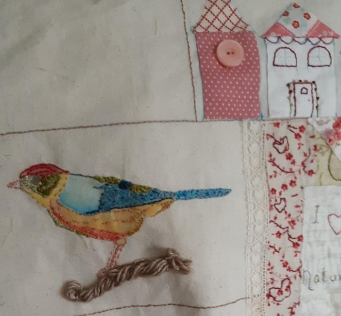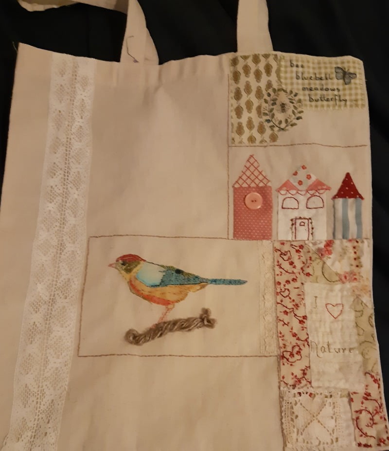 En tenslotte steekjes(slowstich) zetten op lapjes, dit keer op een tasje waar bij ze ook gewerkt heb met pastelkrijt.