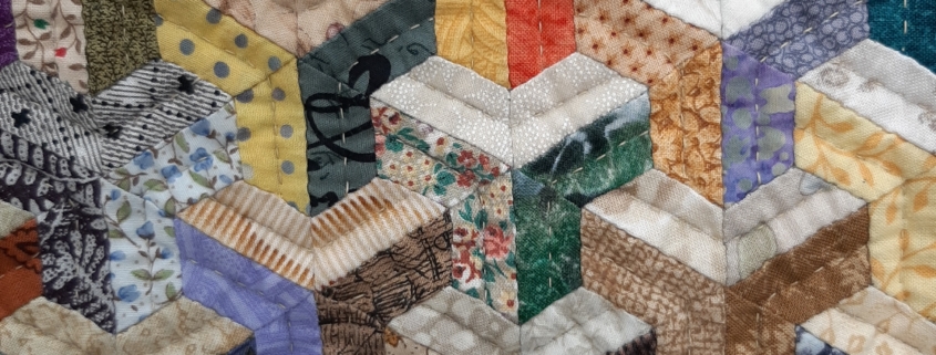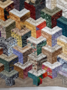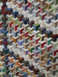In een eerder blog vertelde ik dat voor Nederland de quilt Bubbles of Joy van Anne Lillholm werd geselecteerd. Dat is een hele moderne quilt maar er waren ook enkele echt traditionele quilts te bewonderen. De inzending uit België bestond uit meer dan 5500 stukjes die met de hand aan elkaar waren gezet tot hexagonen en daarna in een soort ‘Inner city’ patroon. Drie lagen, traditionele stofjes met de hand in elkaar gezet en op de hand gequilt. De quilt voldoet volledig aan de kenmerken van een traditionele quilt en heeft een sterke uitstraling door de plaatsing van de kleuren.